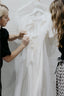 A bustle is a functional alteration which keeps the train off the floor for you to dance the night away, free from having guests accidentally step on your wedding gown. We can create multiple types of bustles or a hand loop. Please note: depending on the style of dress, a bustle might not be achievable, but we are happy to discuss this at your fitting.
