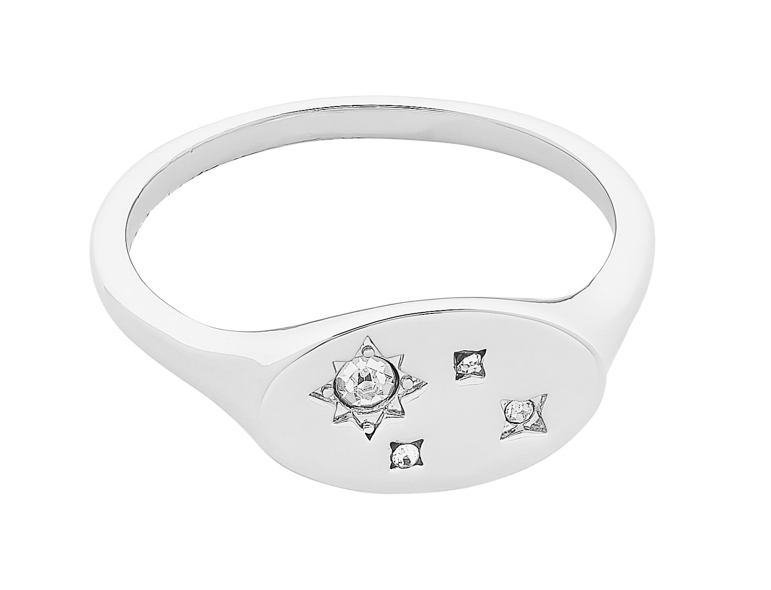 A modern take of the classic signet ring, Goldie features four glimmering clear crystals for a subtle sparkle. Microplated and nickel-free, it's perfect for layering or wearing as an everyday statement.