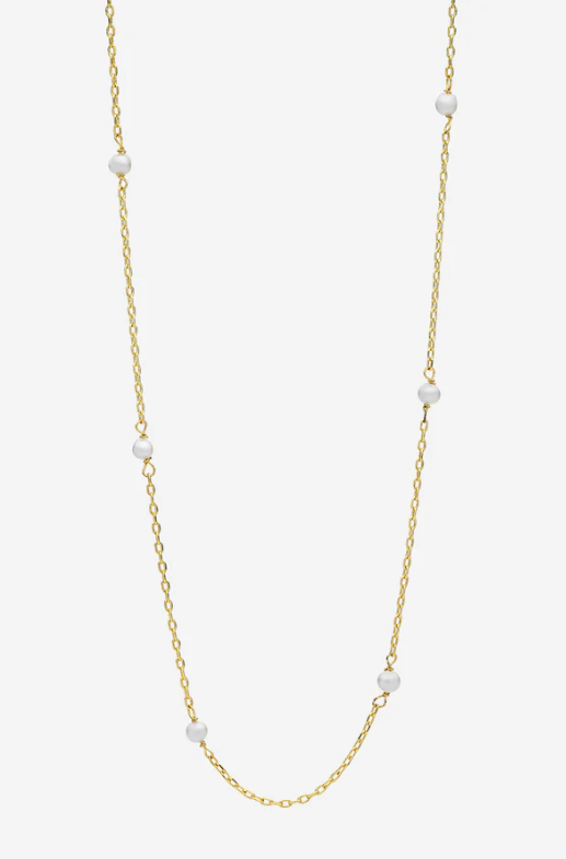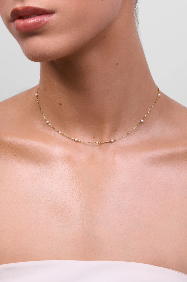 Meet the Liberte Lilibet Pearl Necklace a charming, delicate piece featuring a fine chain adorned with nine freshwater pearls. Measuring 38cm with an extra 2.5cm extension, it’s microplated and nickel-free for comfort. This sweet necklace pairs perfectly with our Lilibet pearl bracelet, adding a playful touch to your look you'll adore wearing.