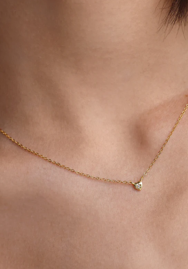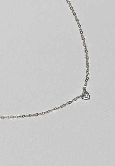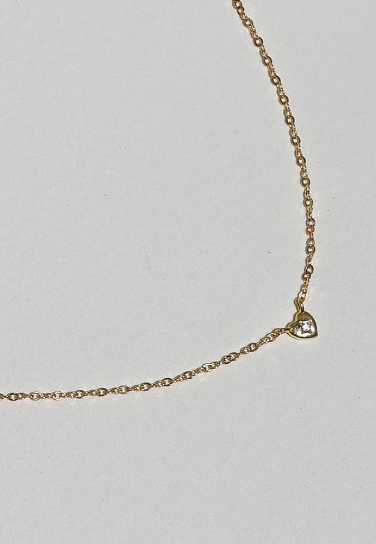The Mini Heart Necklace features a dainty heart shaped pendant embellished with a single stone, suspended on a fine chain.