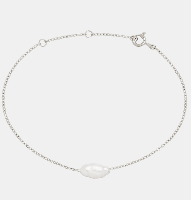 Featuring a single lustrous freshwater Keshi pearl threaded onto a fine gold or silver chain. An elegant addition to your bridal look.
