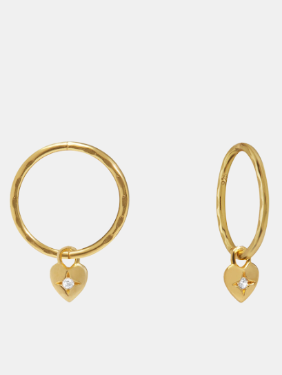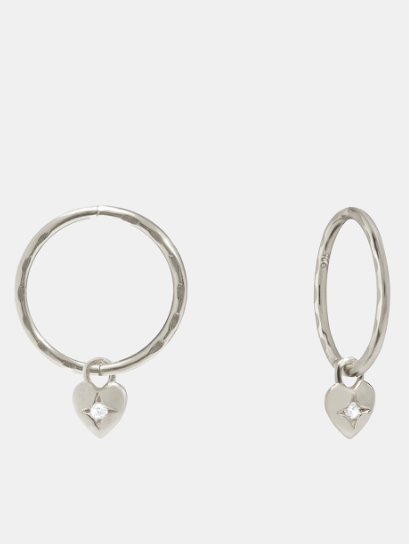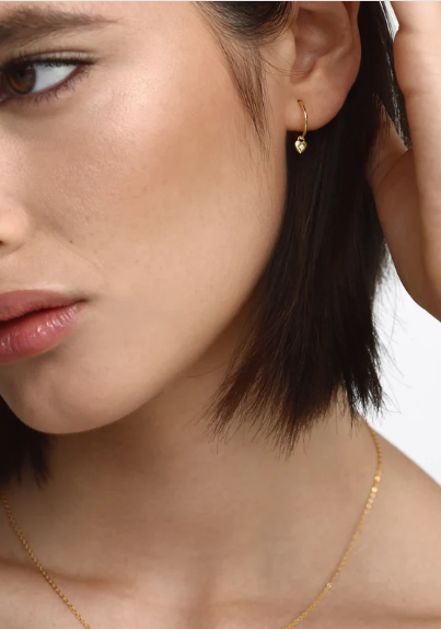 The Mini Heart Hoops feature a dainty heart shaped pendant embellished with a single stone, suspended on a fine hoop.