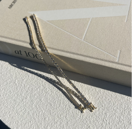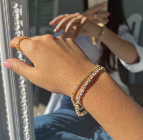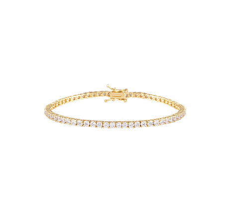 Discover the Bianc Tennis Bracelet , a dazzling gold tennis bracelet by Bianc. It sparkles with claw-set Cubic Zirconia stones, all set in 18CT gold-plated sterling silver. Each stone is one-of-a-kind, so expect charming little differences in color and sparkle compared to the photos. This bracelet is the smaller style shown, measuring 18.5cm long with 4mm stones—perfect for adding a touch of playful elegance to your wrist!